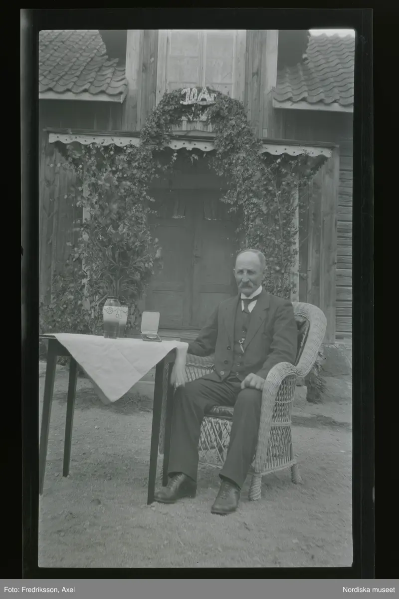 Porträtt av en man som sitter vid ett bord utomhus, framför en lövad dörr.