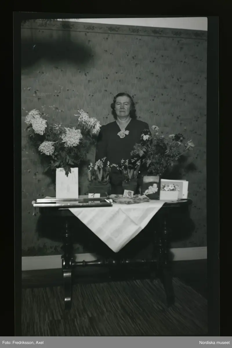 Porträtt av en kvinna som står vid ett bord fullt av gratulations-blommor.