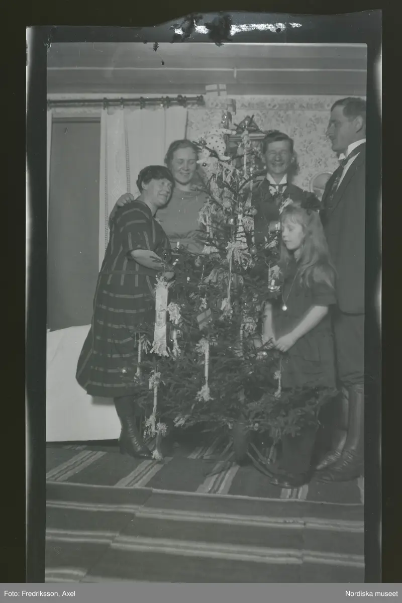 Familjen Fredriksson står runt en julgran. Frida längst till vänster, Axel längst till höger intill sin bror Ivan och dottern Anna-Lisa,