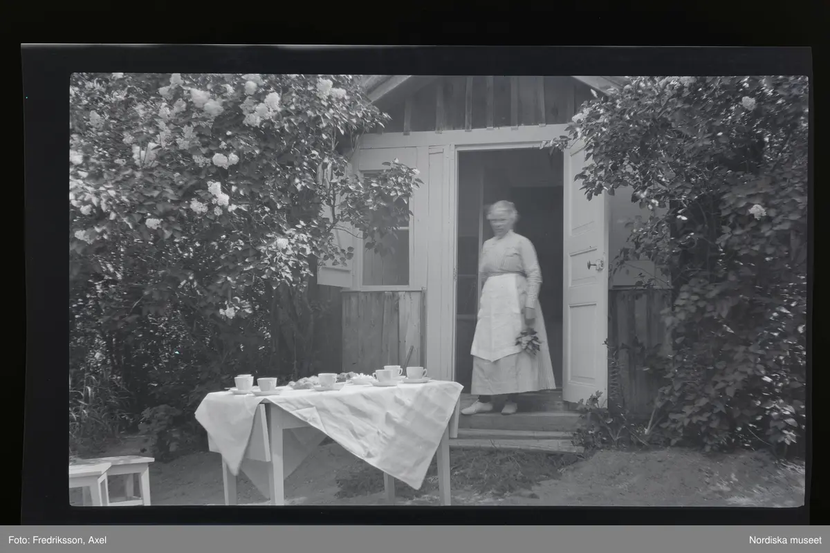 En kvinna står i dörren till ett hus. I trädgården framför henne står ett bord dukat med kaffekoppar och kakor.