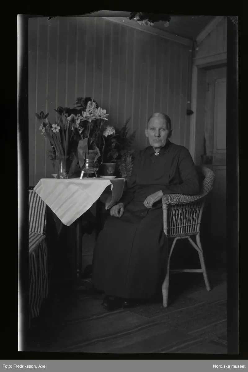 Porträtt av en kvinna som sitter vid ett bord med gratulations-blommor.