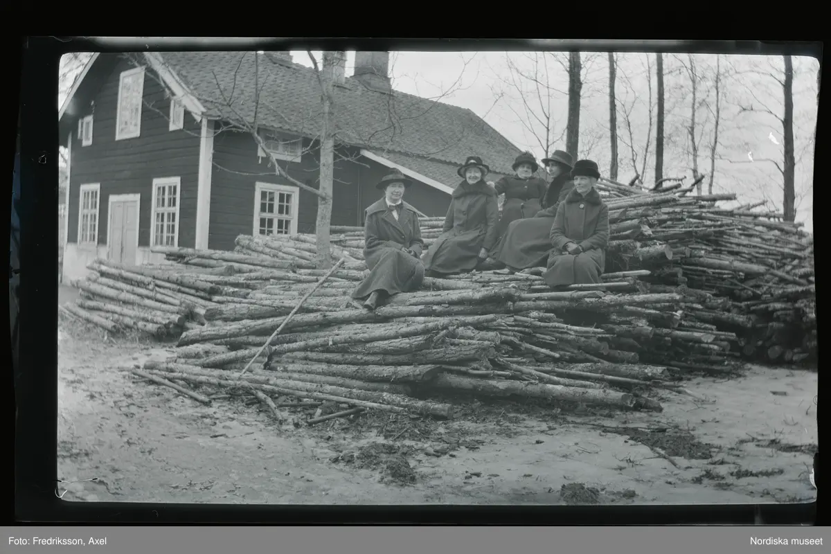 Fem kvinnor sitter uppe på en hög fällda trädstammar utanför ett hus.