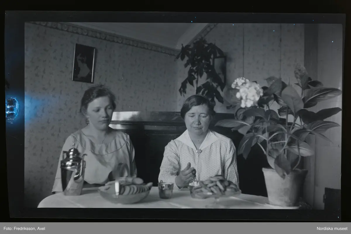 Två kvinnor sitter vid ett bord och fikar. Kaffe och fat med kakor står på bordet.