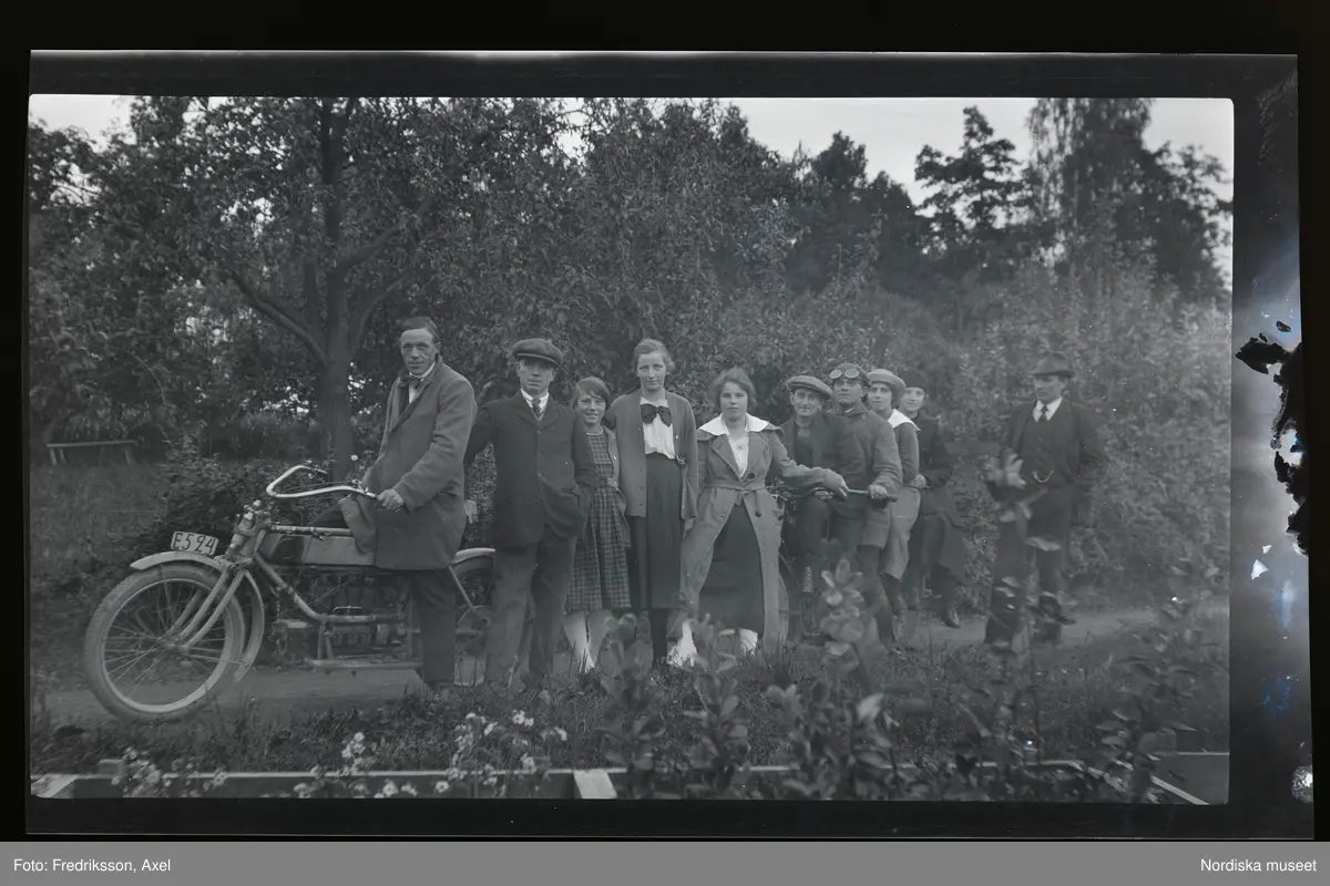 En grupp män och kvinnor står omkring och sitter på ett par motorcyklar.