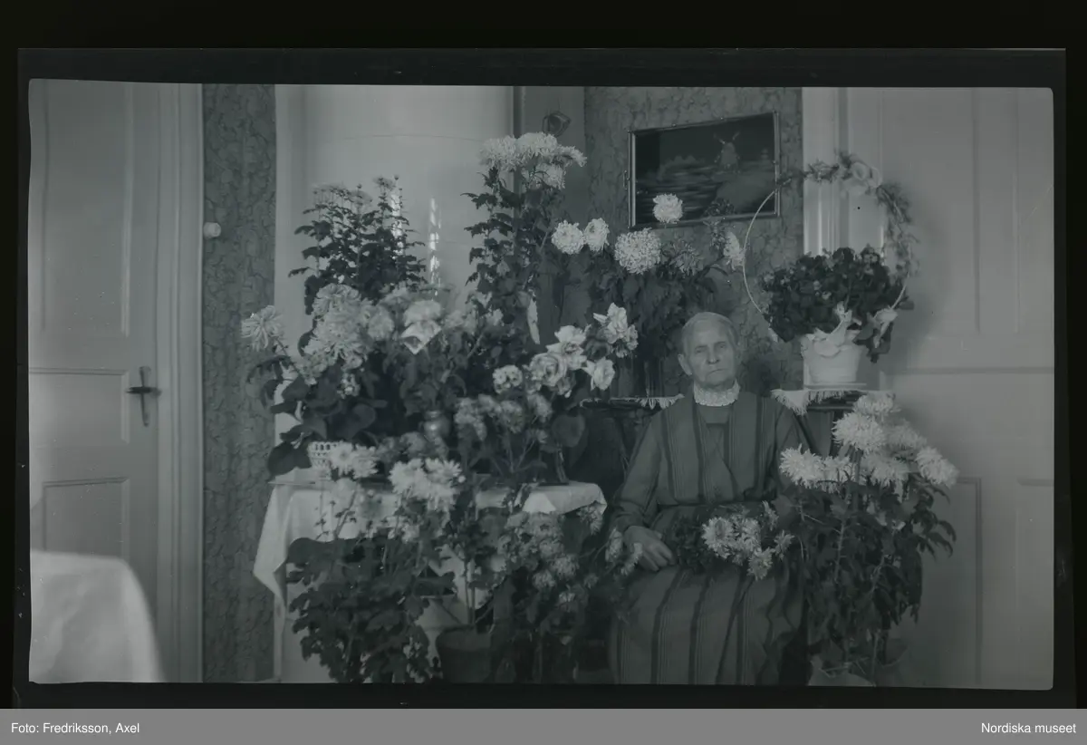 En kvinna sitter omgiven av gratulations-blommor.