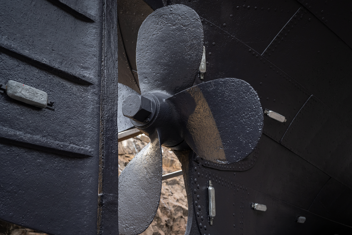 Fyrskeppet Finngrundet i Östra dockan på Stockholms reparationsvarv Beckholmen. Skrovet har tjockleksmäts och ommålats, nya offeranoder på plats.