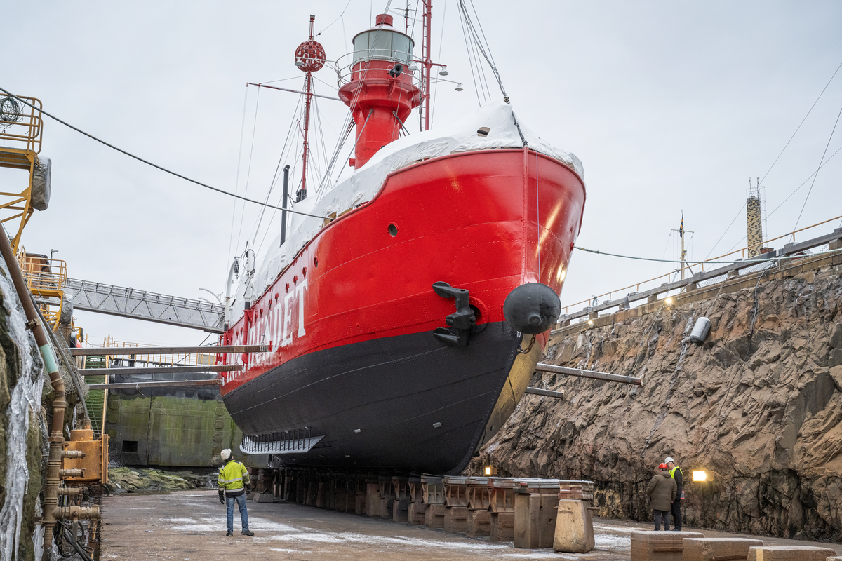 Fyrskeppet Finngrundet i Östra dockan på Stockholms reparationsvarv Beckholmen. Skrovet har tjockleksmäts och ommålats, nya offeranoder på plats.