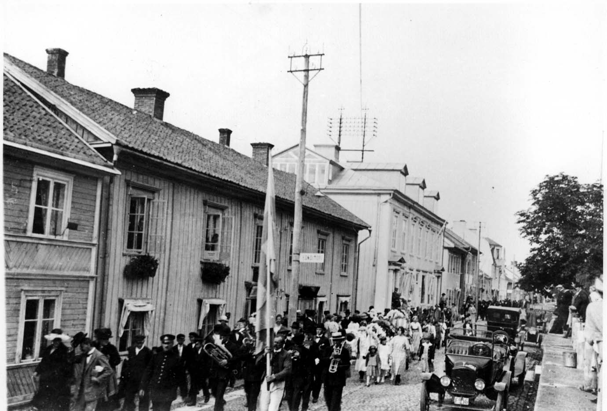 Fanbärare, musikkår och ett litet blomstertåg på Brahegatan i Gränna i samband med hembygdsfest.