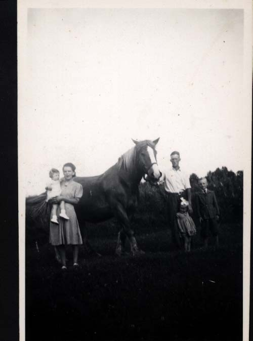 En, kvinna och två barn står vid en häst som mannen håller i. Kvinna har ett litet barn i famnen.
