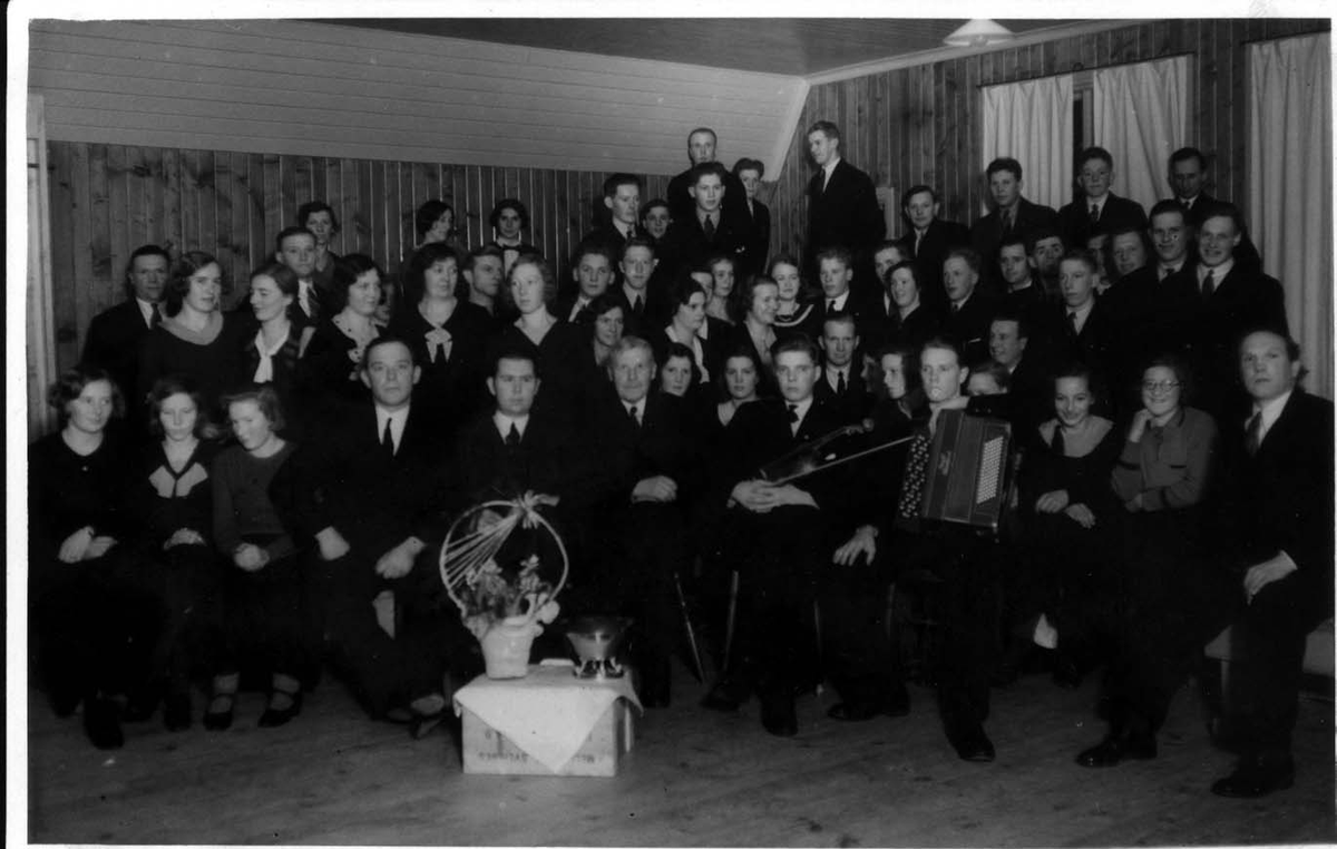 Ett stort sällskap kvinnor och män i samlingslokal. Längst fram sitter två män med fiol respektive dragspel.