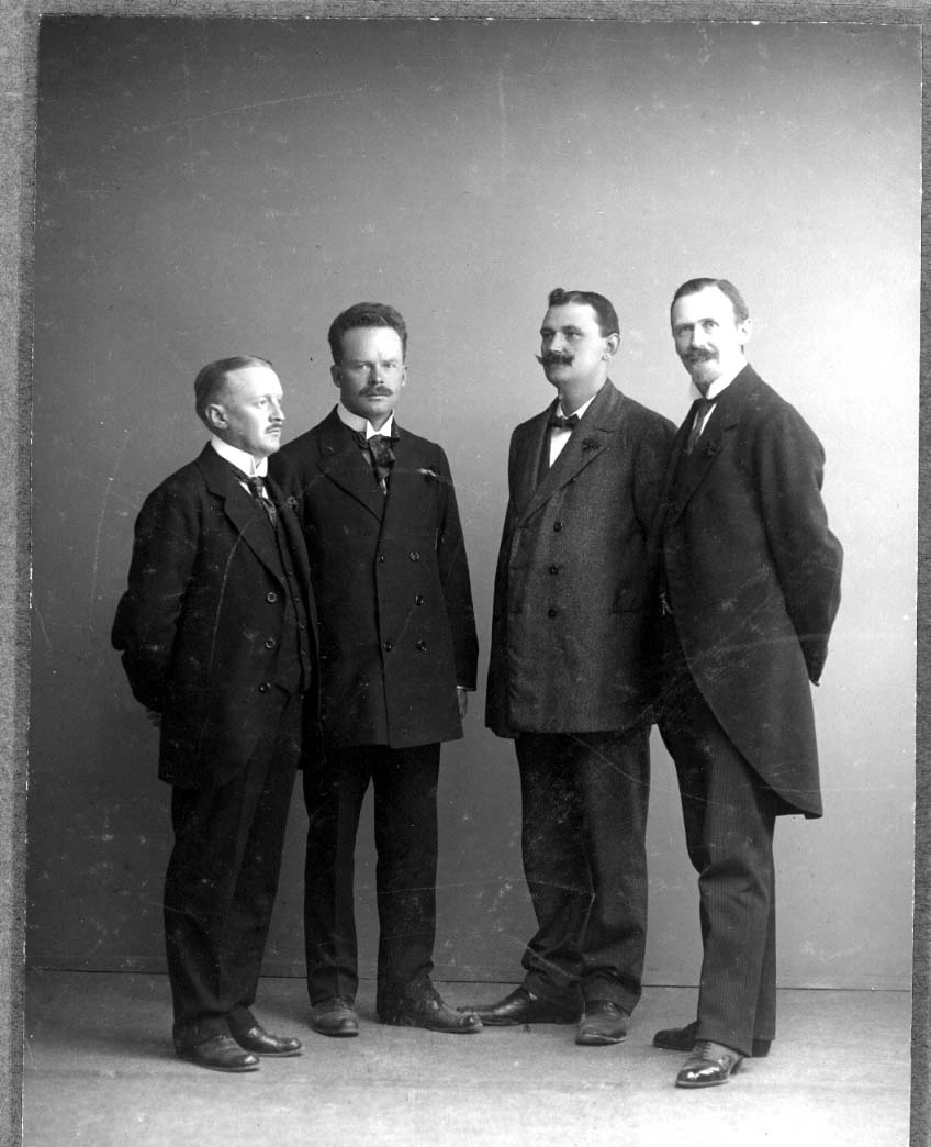 Gruppbild med fyra män, påskrift: "Med hjertligt tack! Till minne af '20 års kvartetten' 12/9. 1915."