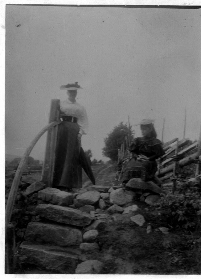 En kvinna med hatt och parasoll i vänster hand, en flicka med hatt sitter på en sten intill. De är på en äng, vid gärdesgård, vid en stentrappa som leder ner.