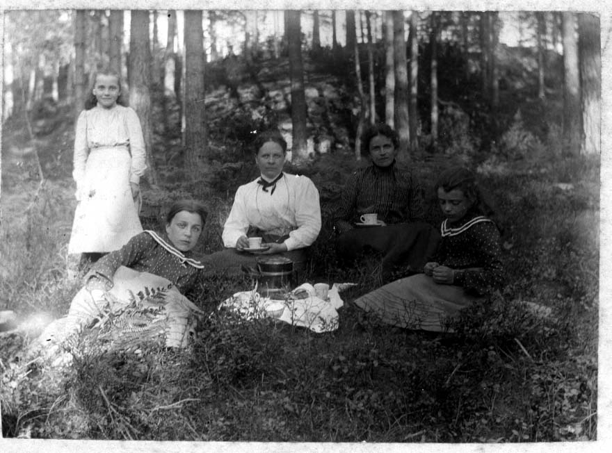 Två kvinnor och tre flickor sitter i gräset framför en skogsdunge och fikar.