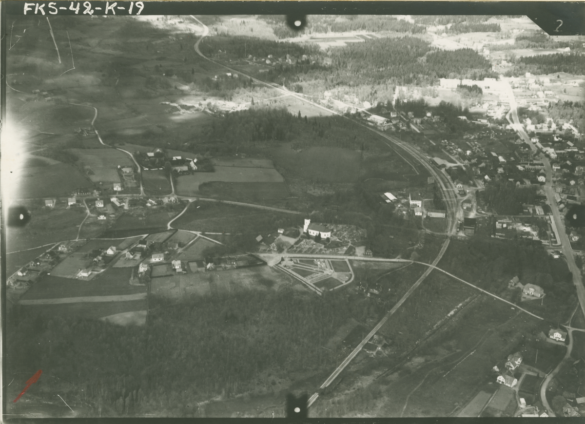 Titel: Flygbild av Norra Åkarps kyrka tagen den 20 maj 1942. Tillhörande bildrapport, övningsbild från Flygkrigsskolan, F 5.