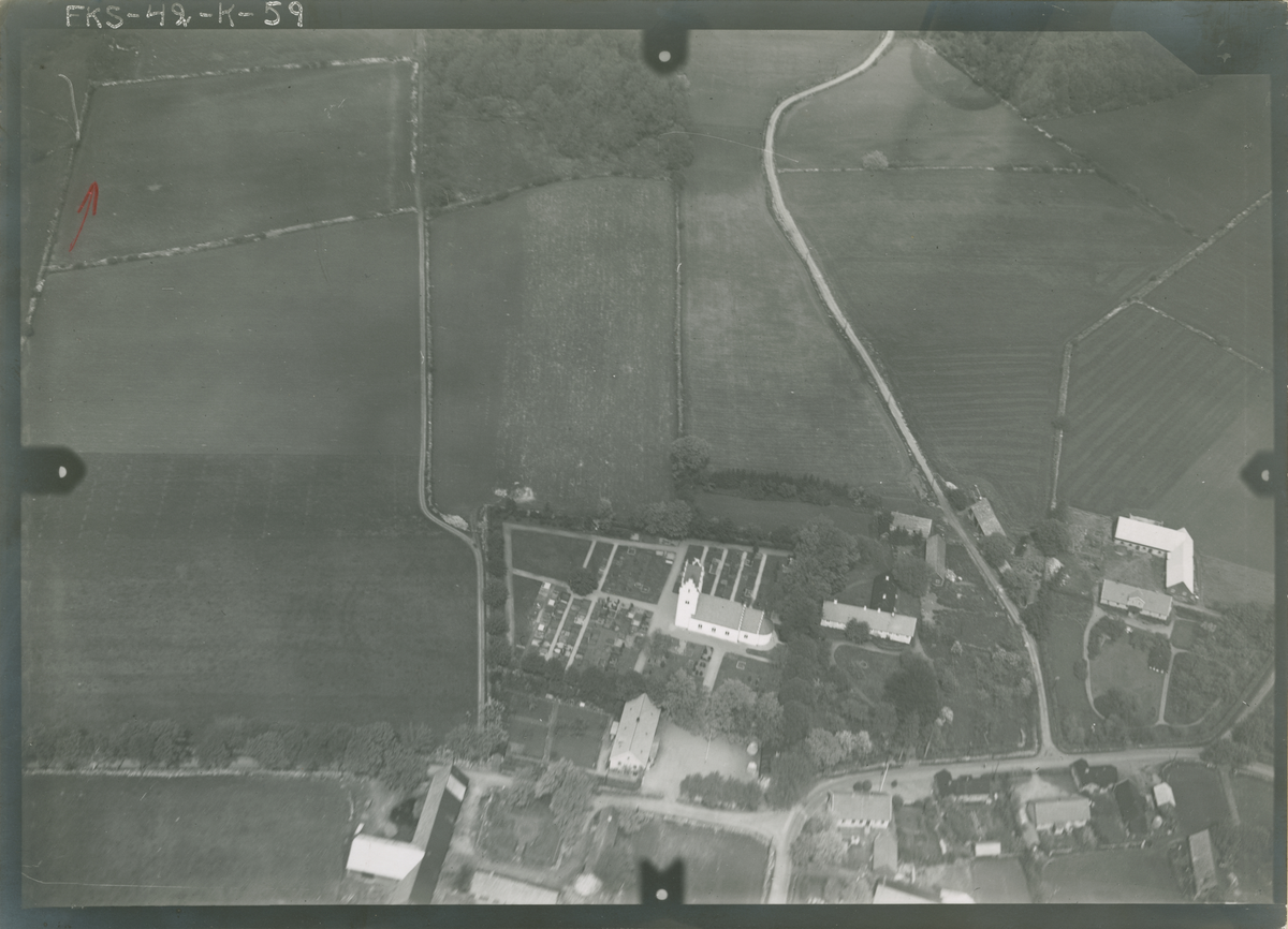 Titel: Flygbild av Äsphult kyrka tagen den 1 juni 1942. Tillhörande bildrapport, övningsbild från Flygkrigsskolan, F 5.