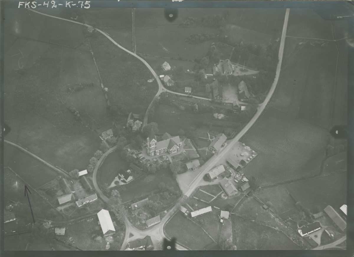 Flygbild av Södra Rörum kyrka tagen den 1 juni 1942.