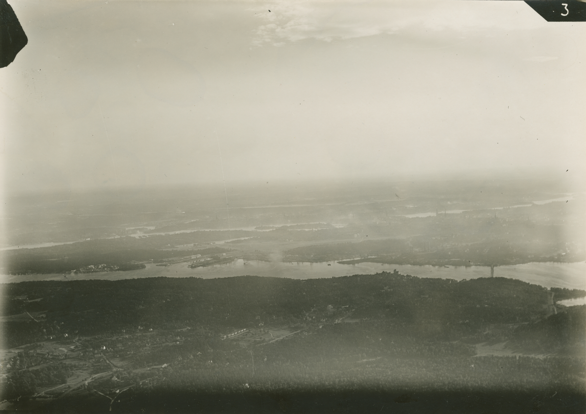 Flygbild över Stockholm i närheten av Lindarängens sjöflygplats, augusti 1931.