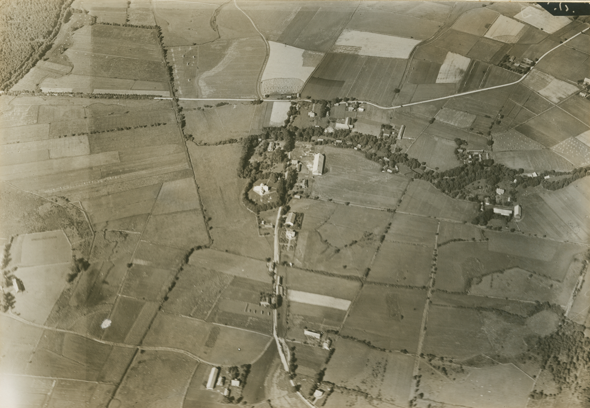 Flygbild av Åsle kyrka i samband med Västgötamanövern i augusti 1931. Tagen från söder.