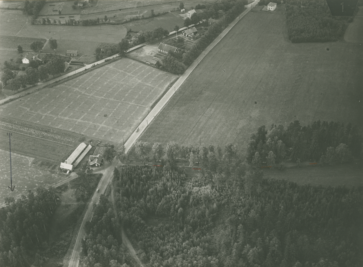 Flygbild av vägskäl utanför Aspö herrgård utanför Skövde, 30 augusti 1935.