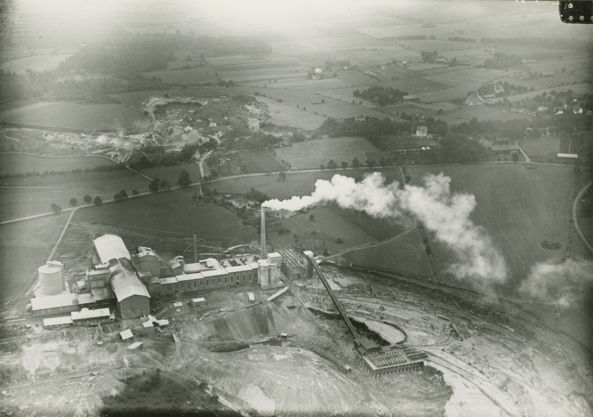Titel: Flygbild av fabrik i Skövde, 31 augusti 1935. Tillhörande bildrapport, flygspaningsövning tillsammans med andra vapenslag, med markeringar inritade.
