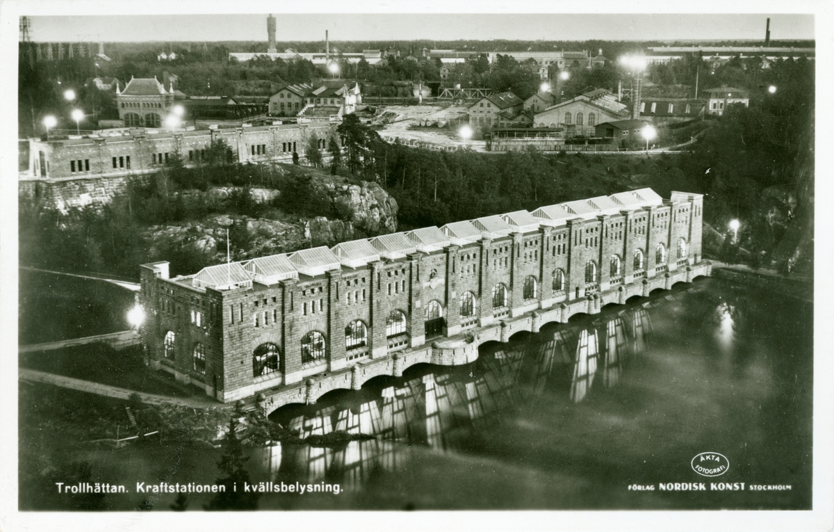 Trollhättan. Olidans kraftstation. "Kraftstationen i kvällsbelysning"