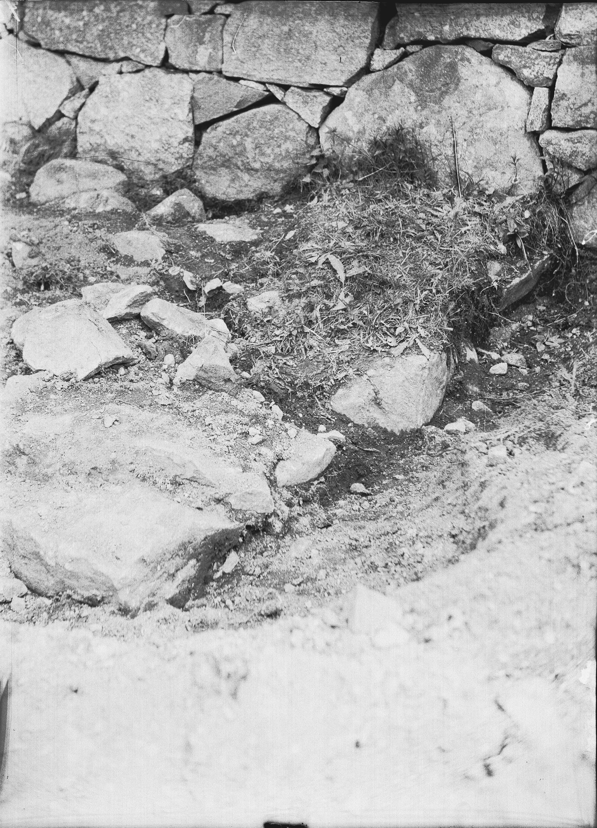 Södra murens västra del, utanför kyrkogårdsmuren, med sydvästra hörnet, mot sydväst.
