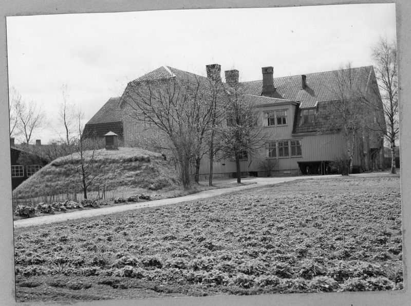 Skolbyggnaden. Byggnad 1. Skolbyggnaden sedd från norr. Framför byggnaden jordkällaren P 7:5. Längst till vänster skymtar vedboden P 7:3 Vänersborg