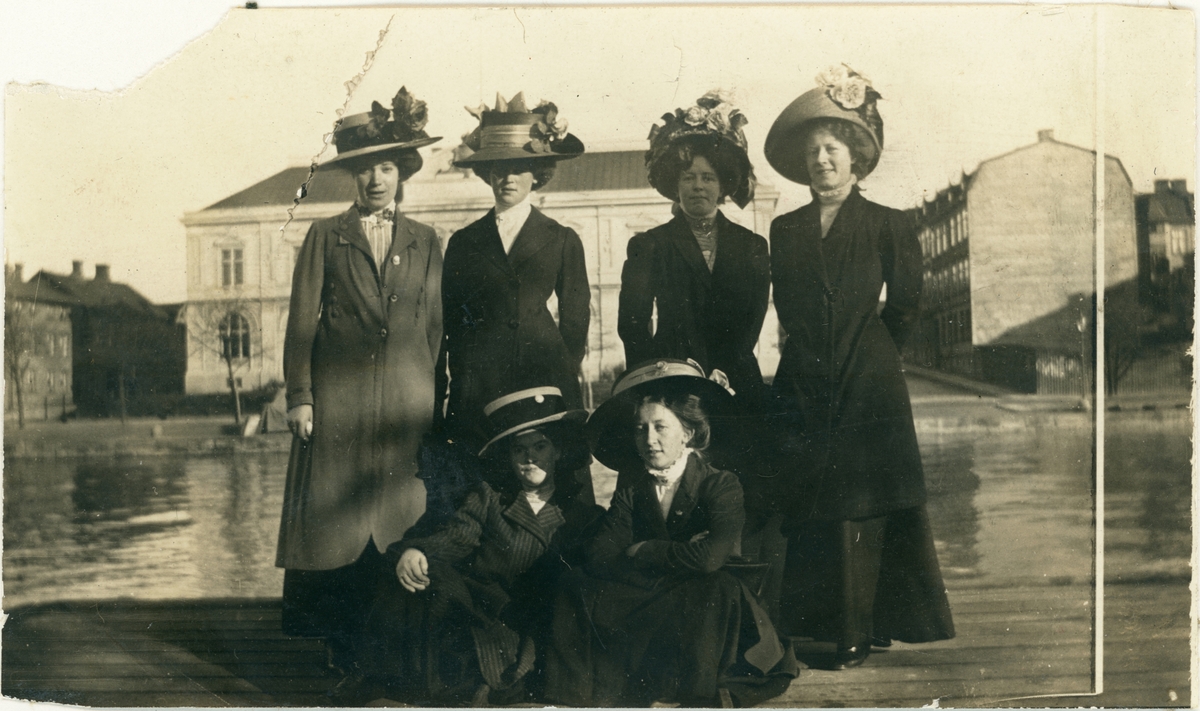 Vänersborg. Gruppbild vid hamnkanalen, Riksbankshuset i bakgrunden