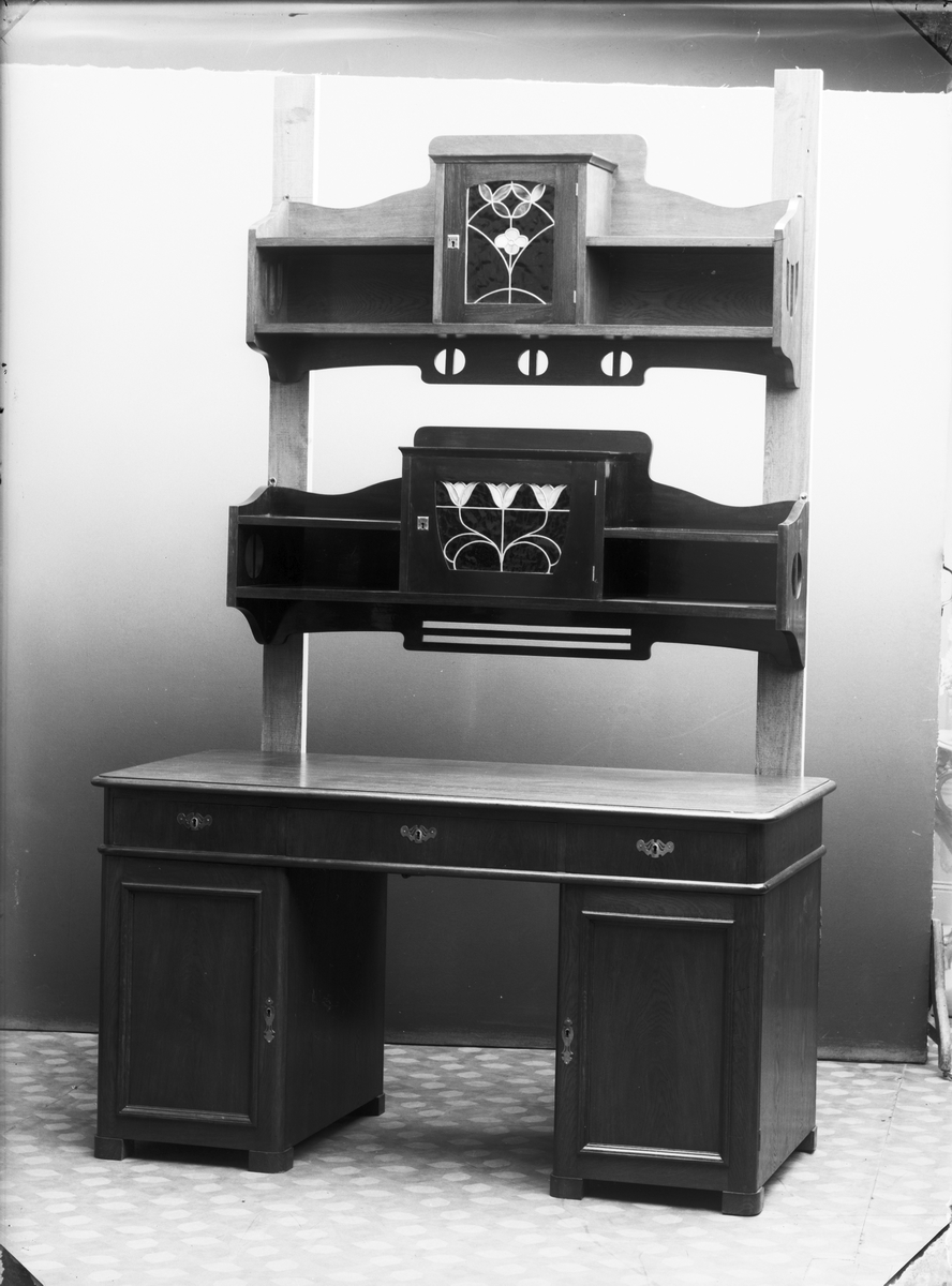 Möbler Slöjdtekniska skolan Vänersborg. Skrivbord med överhyllor.