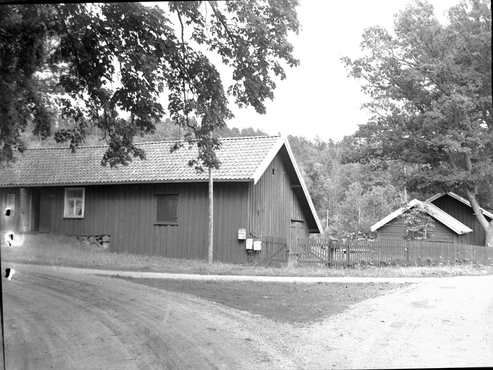 Stall och ladugårdsbyggnader med bod och garage. Till höger hemlighus och till höger gammal källare. Västra Tunhems prästgård