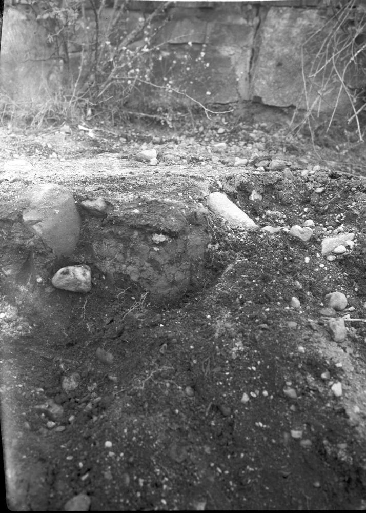 Fyndplats E från söder. Urnan synes mellan stenarna. I bakgrunden stenfoten till Norlins stuga. Skimmo Gärdhem