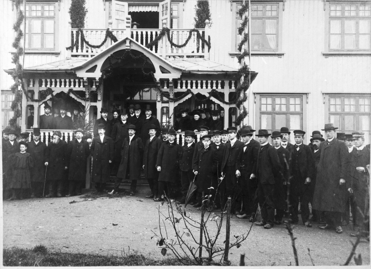 Färgelanda. Invigningen av folkhögskolan Landshövding Husberg mitt på trappan.