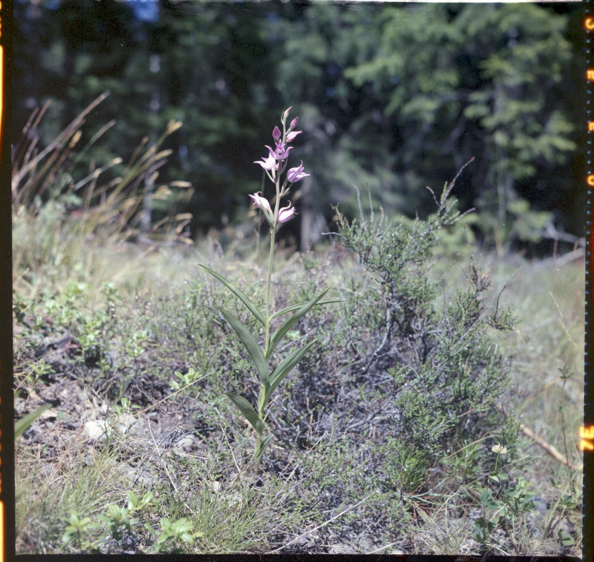 Titel: Orkidén Rödsyssla, Cephalanthera rubra. Tisselskog