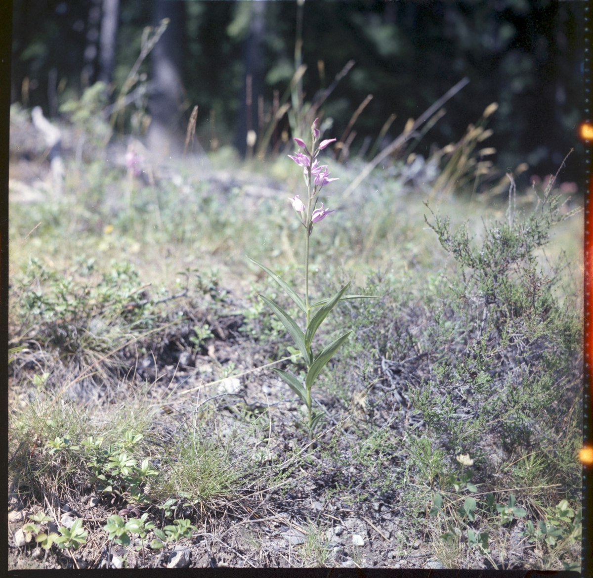 Orkidén Rödsyssla, Cephalanthera rubra. Tisselskog