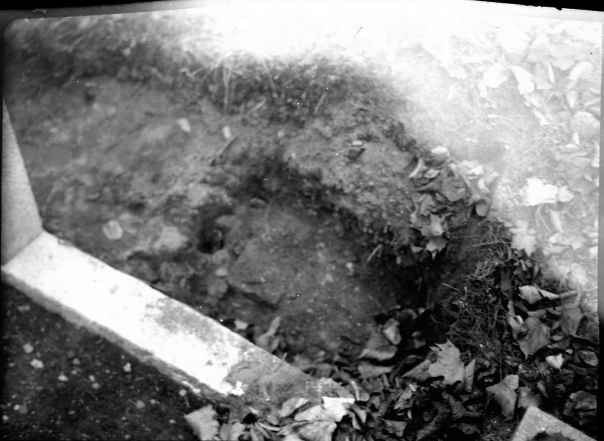 Kyrkogården. Mellan två nutida gravar framgrävt parti av södra yttermuren. Edsleskog