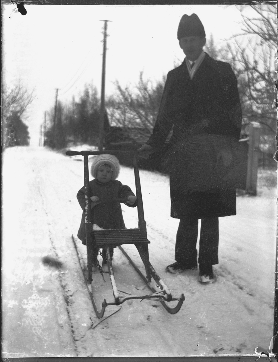 Olof och Kerstin på vinterpromenad med sparken.