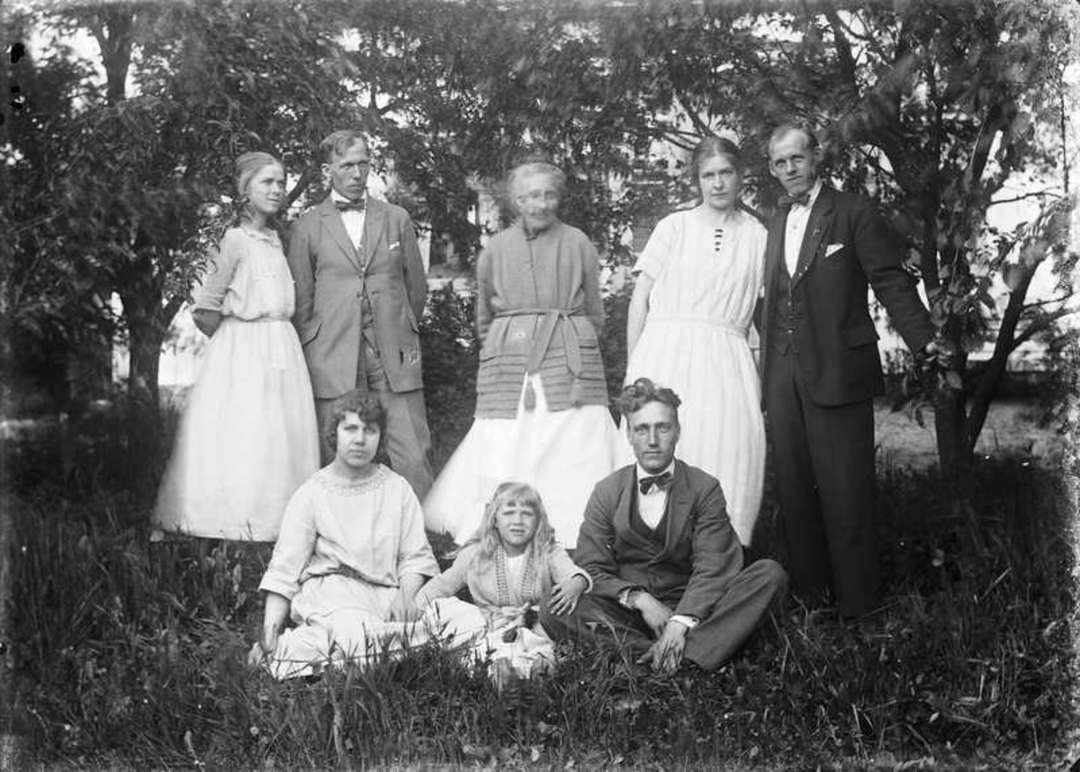 Okända personer samlade i trädgården för fotografering.