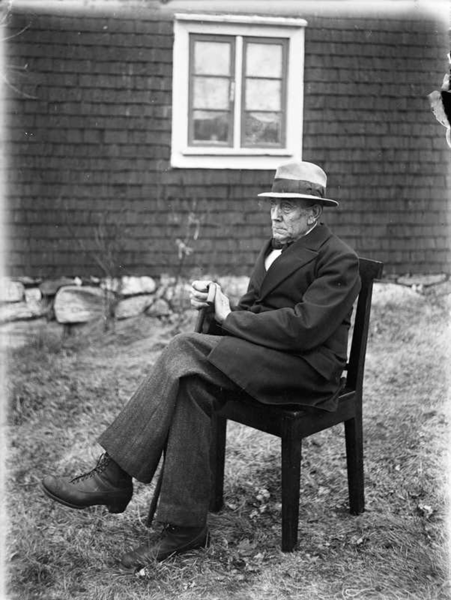 Porträtt av en äldre herre sittandes i stol utanför huset.