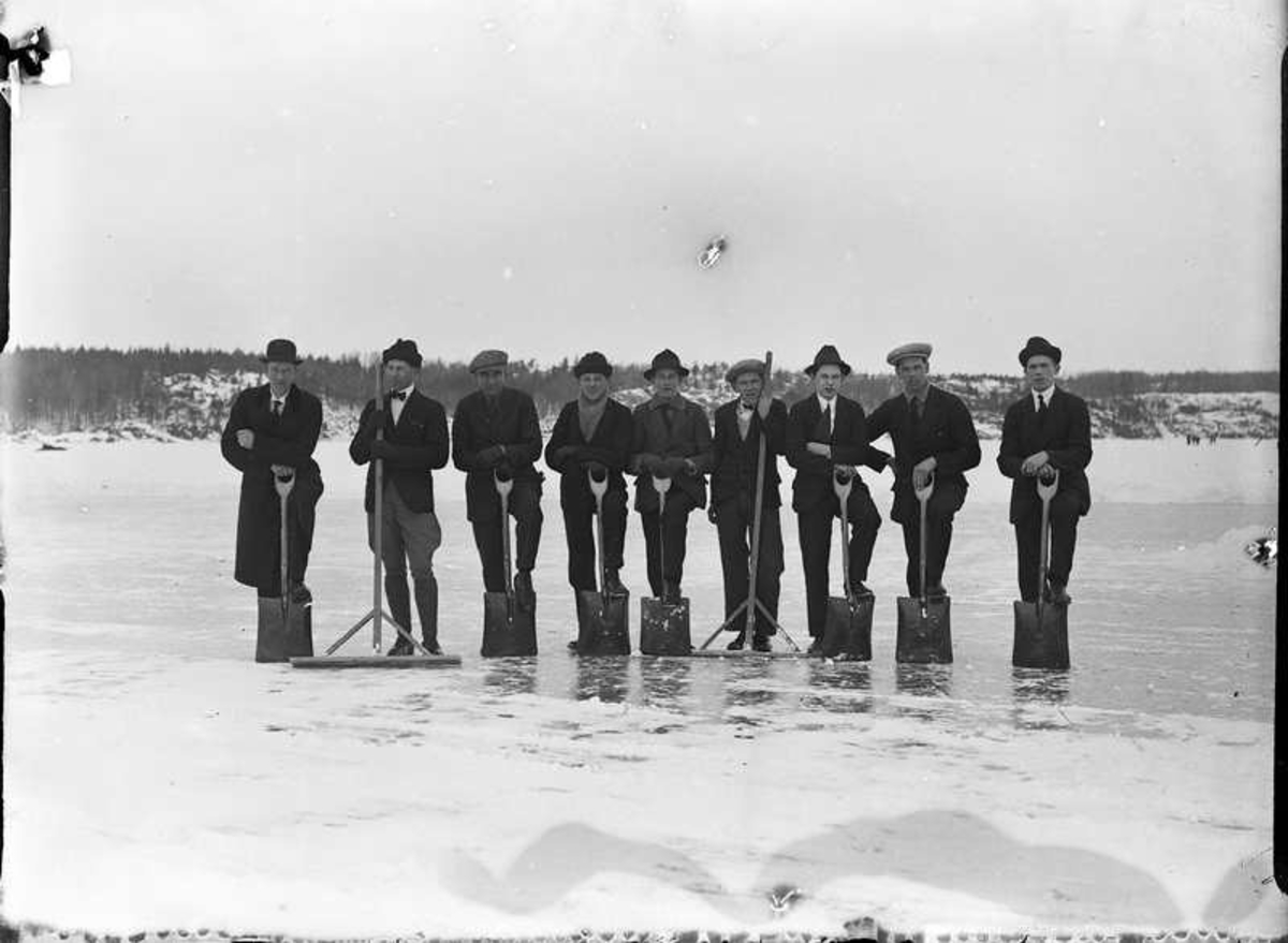 Nio män med spadar på isen, sannolikt Vänersborg.
