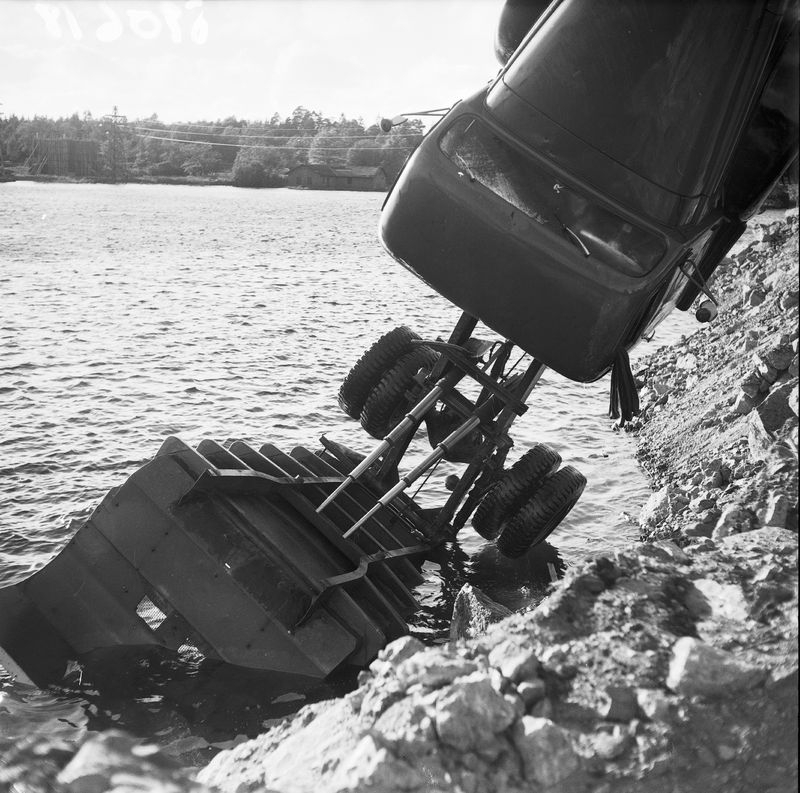 Titel: Wargöns AB. Byggnation av PM 5 1959-60. Foto och påförd text av dåvarande ritkontorschefen Ragnar Söderberg. Ett missöde vid stenpiren som slutade bra denna gång, endast bilen hamnade i vattnet. Sakta men säkert lyftes bilen upp från sitt ofrivilliga dopp i Göta älv den 18/6 1959.
