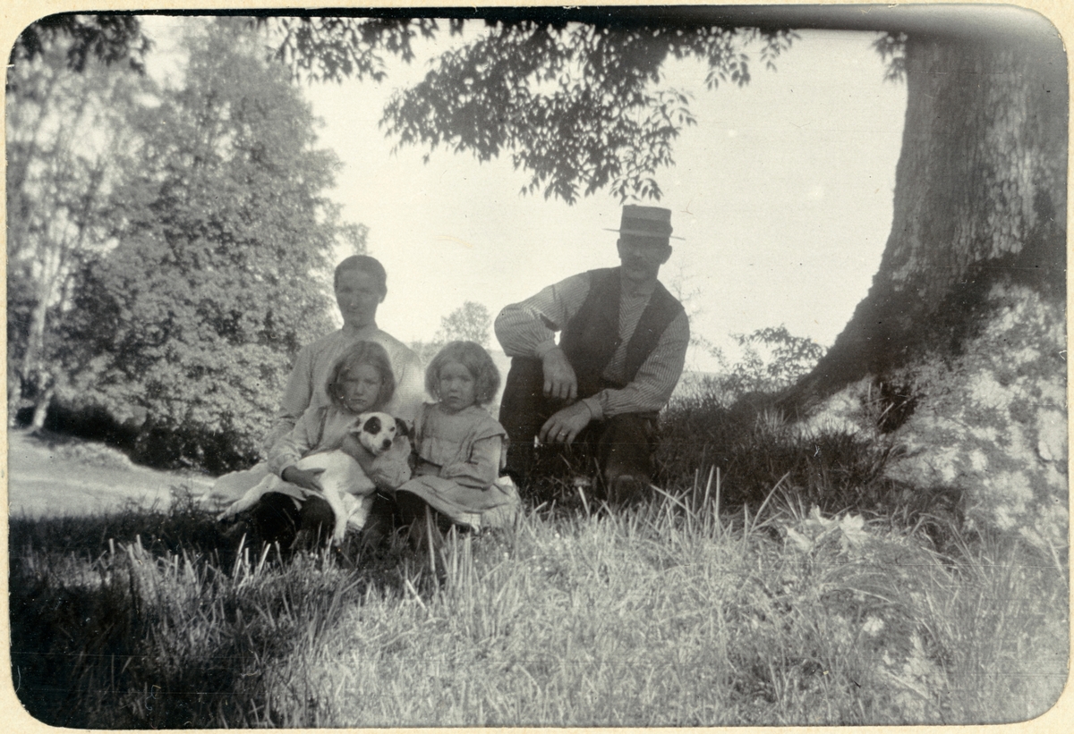 Okänt sällskap. Ett av barnen har en hund i famnen