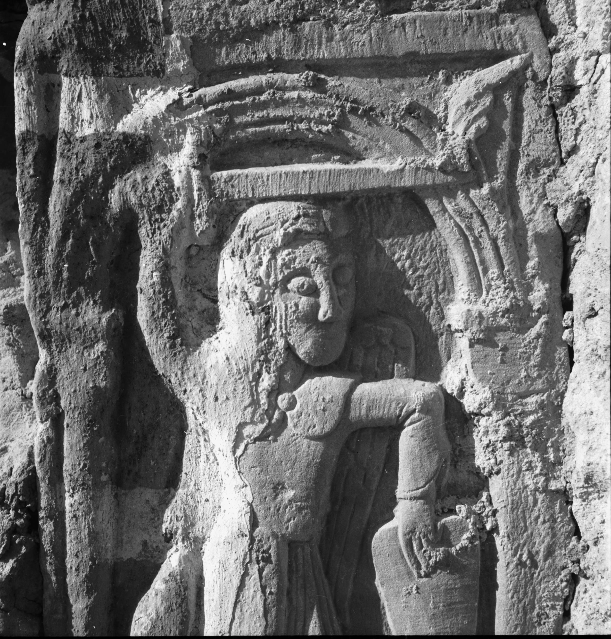 Relief av ärkeängel Mikael (övre delen) från äldre sydingång till långhuset.