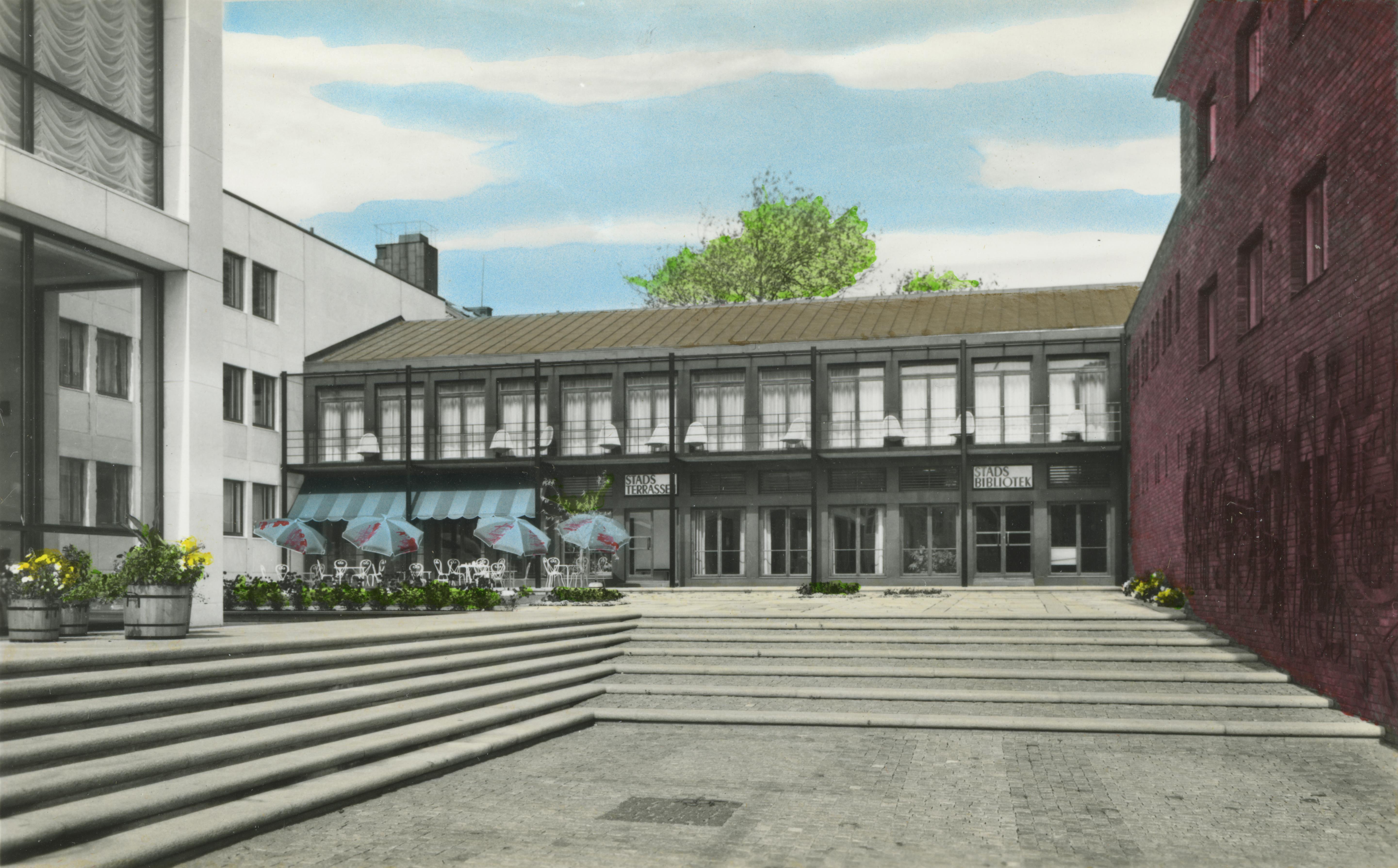 Stadsterrassen och Stadsbiblioteket. Handkolorerad variant av ac00815.