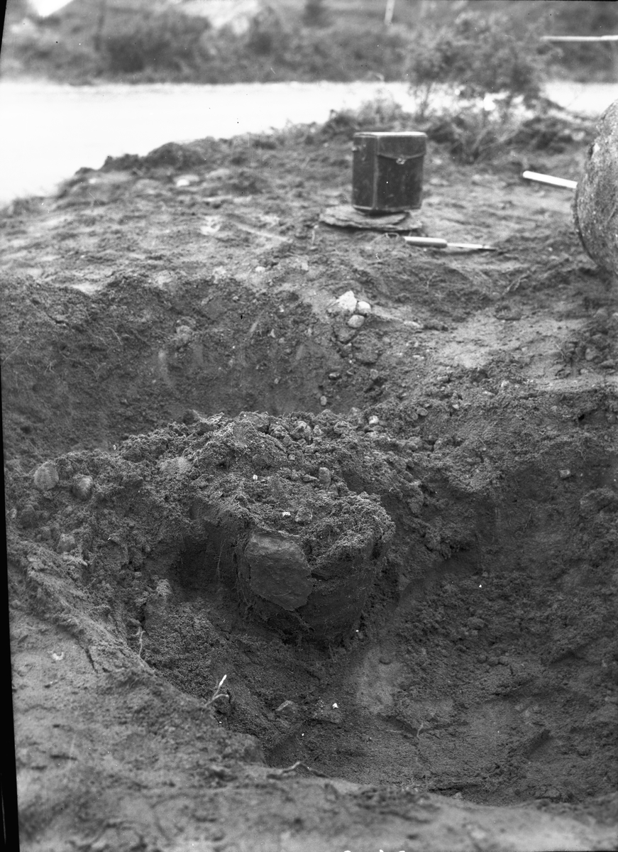 Grav 2 under utgrävning. Den med brända ben fyllda urnan i förgrunden var täckt med stenplattan under kameraväskan. S Hillingsäter Färgelanda
