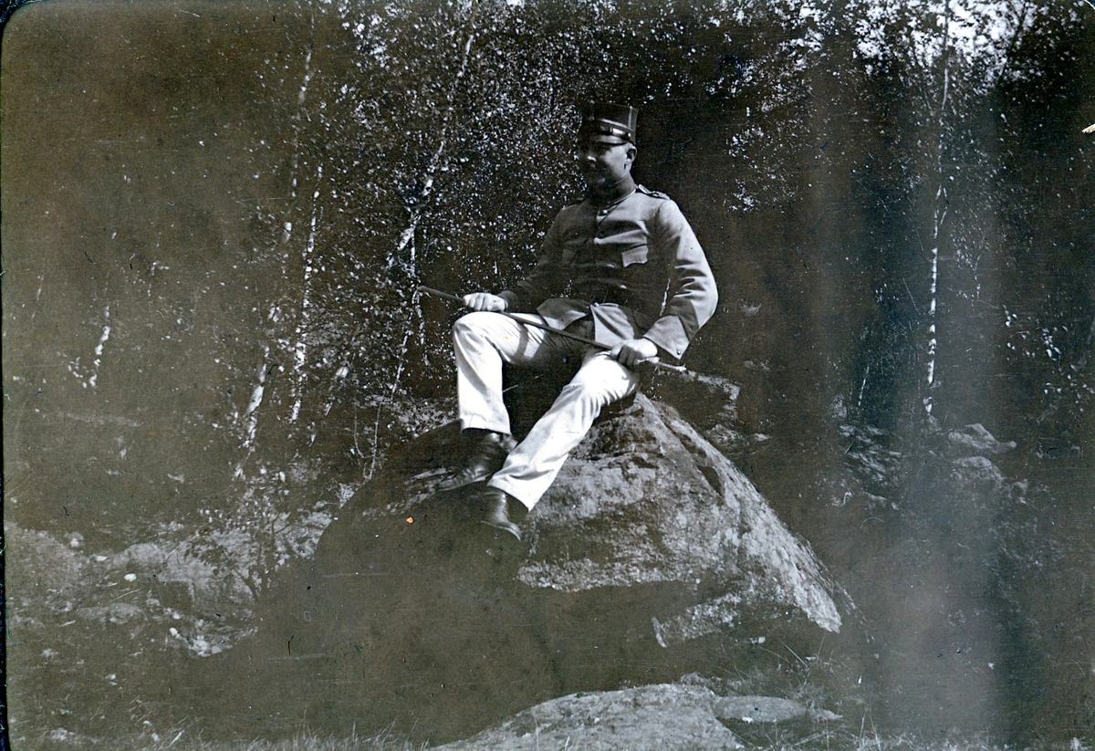Oidentifierad underlöjtnant, sittande på sten. Hultsfreds slätt. Kalmar regemente.