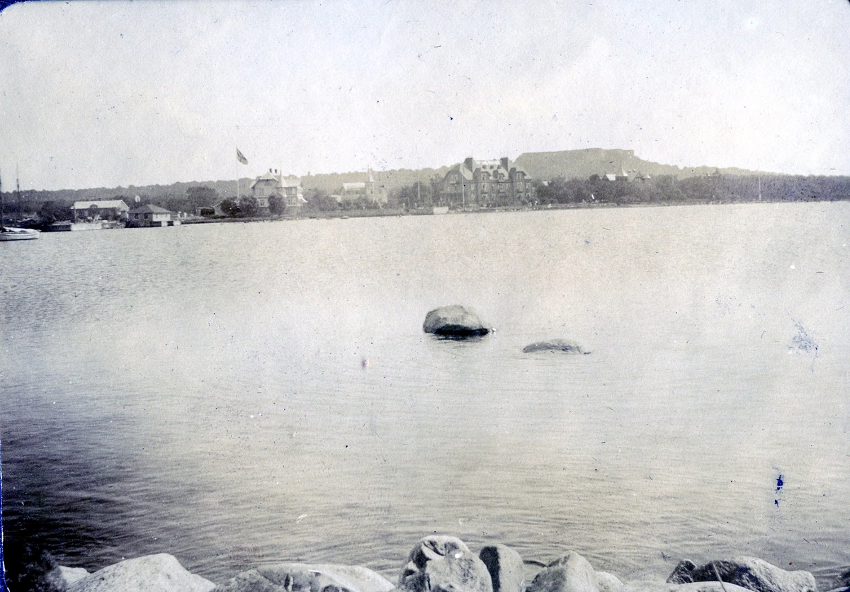 Titel: Oidentifierade civila på utflykt. Vy över oidentifierad hamnstad.