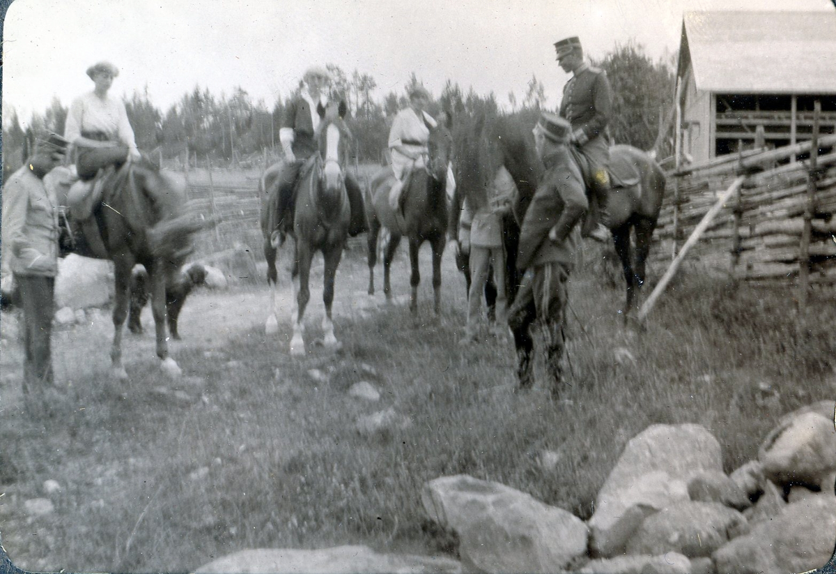 Titel: Oidentifierade officerare med damer till häst. Kalmar regemente.