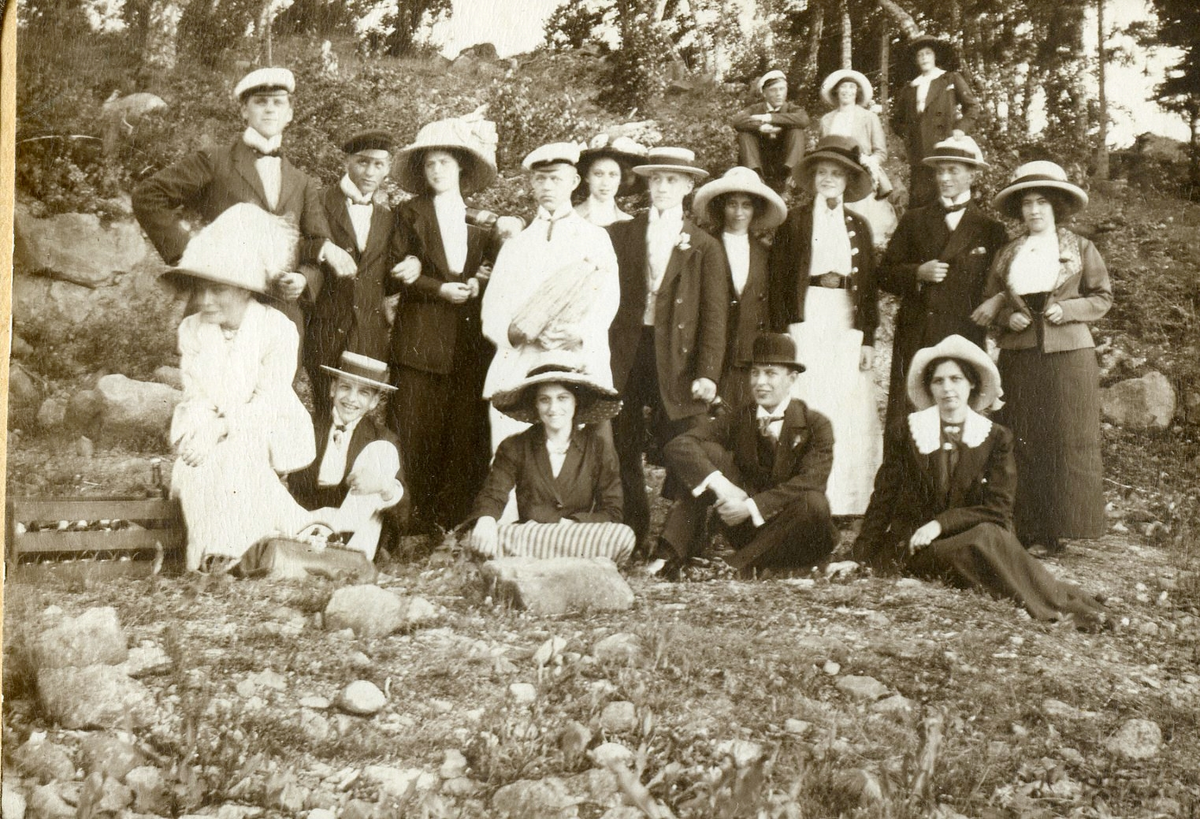 Titel: Finklädda personer på utflykt.