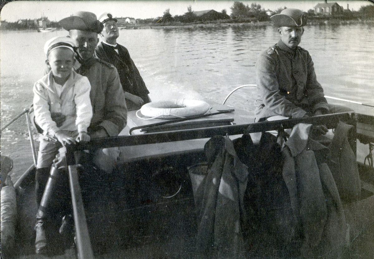 Två oidentifierade officerare i uniform m/1910, en äldre man och en pojke i motorbåt. Kalmar regemente.