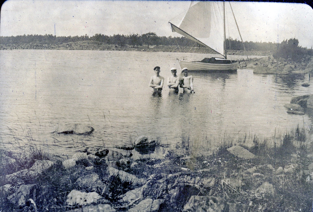 Titel: Oidentifierade civila på utflykt. Tre män i vattnet.